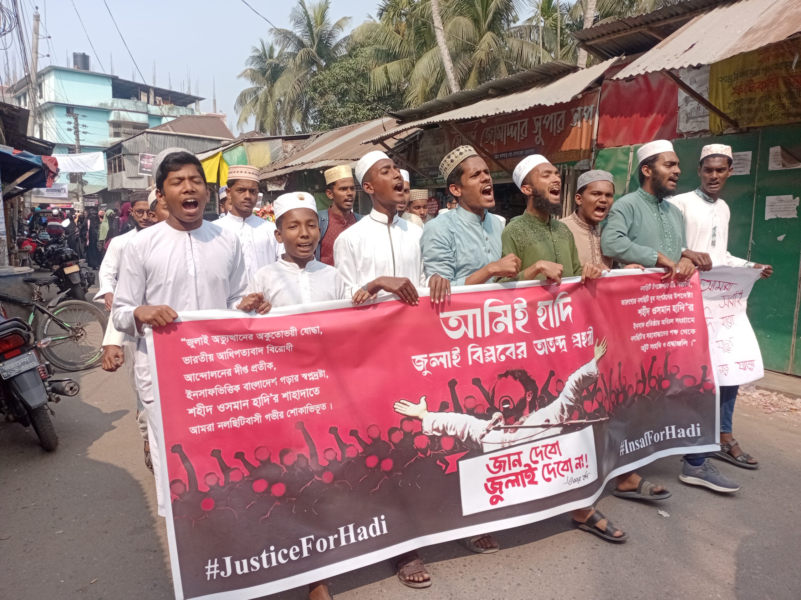নলছিটি ইসলামিয়া ফাজিল মাদ্রাসার ছাত্র-ছাত্রীদের প্রতিবাদ মিছিল: ওসমান হাদি হত্যার বিচারের দাবি।